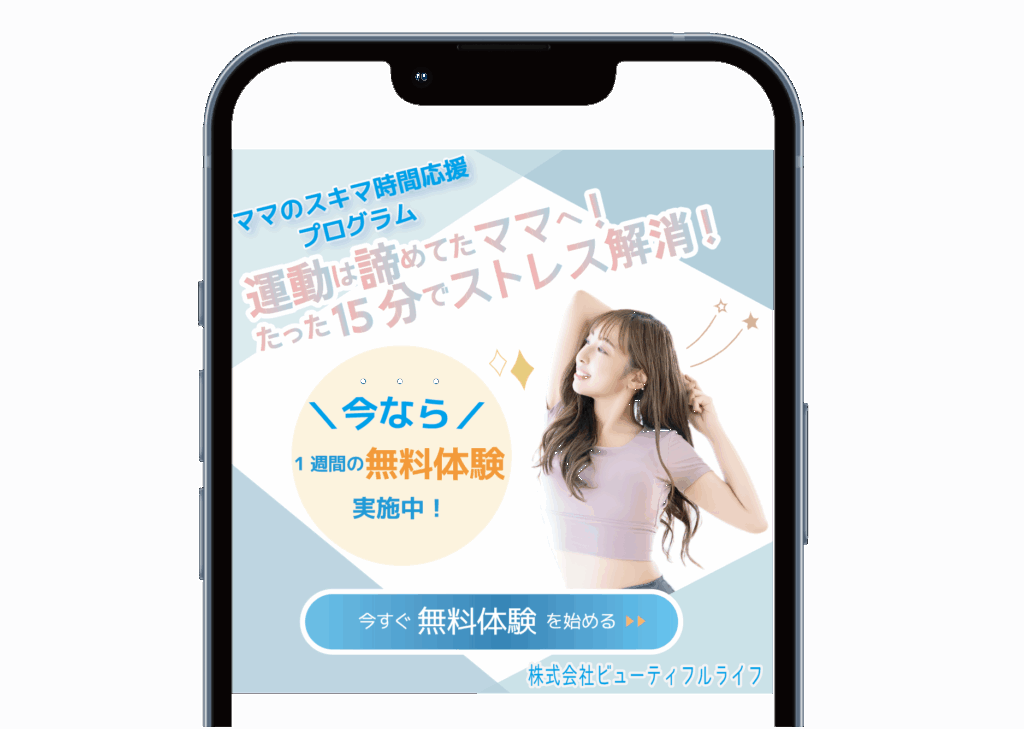 SNS広告用バナーを作成しました。忙しいママ層に『私にもできる!』と感じていただき、体験レッスンへ誘導したい」というご要望を元に制作。親しみやすいトーンで心理的なハードルを下げ、お申し込みまでをワントップで完結させるデザインをご提案しました。ご要望に合わせた最適なツール選定も行っています。